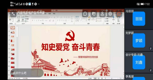 研究生党支部以“知史爱党,奋斗青春”为主题,利用钉钉会议在线上举办党史学习教育专题党课,并邀请线上av