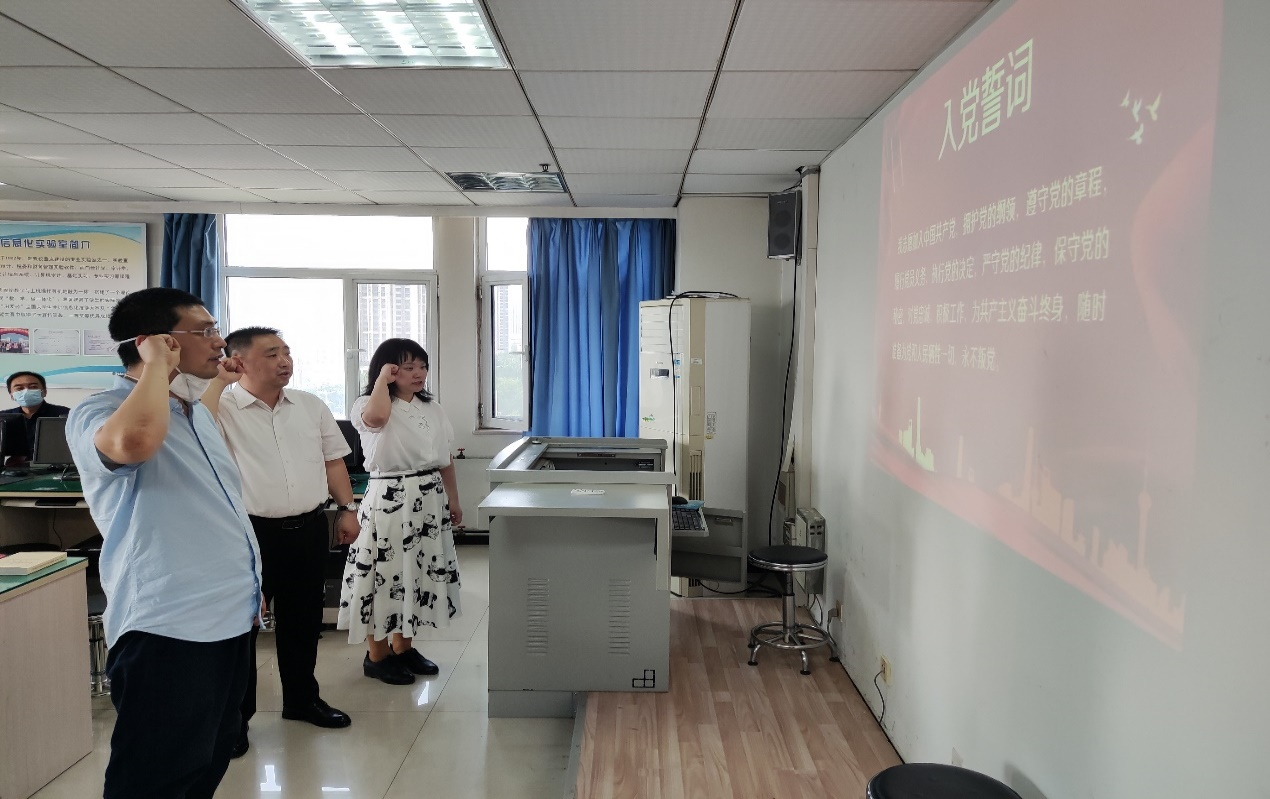 首先,在支部全体党员的见证下,邓兴平带领两名新党员教师陈建明、胡洁博士进行了入党宣誓,领宣入党誓词。