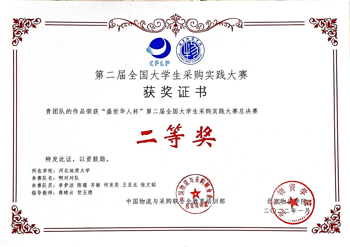 采购管理专业宿丽霞、刘丽贤老师指导的“重案六组队”(黄博飞、崔俊杰、张翰文、黄洧杰、许天瑜、曹旭东)和蒋晴云、贺玉德老师指导的“啊对对队” (李梦洁、陈瑾、齐敏、何发亮、王亚龙、张文韬)均获得全国二等奖。比赛考察学生较强的团队合作意识、扎实的专业知识以及方案展示、PPT制作等专业能力,也充分锻炼了学生的实践操作、解决问题的能力,激发了学生的创新意识。