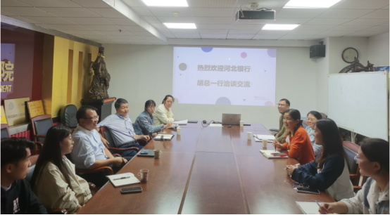 专业相结合,强调了当前金融业在绿色发展、绿色金融、数字化转型、普惠金融、科创金融等方面的探索,进而分享了河北银行为新入职成员提出的三个“1”建议。其次,胡总与学院领导就河北银行与学院在科研、培训方面的可能合作进行了深度沟通,为两单位的合作模式、合作形式展开了详细探讨。最后,胡总对研究生就业提供了一些指导建议。