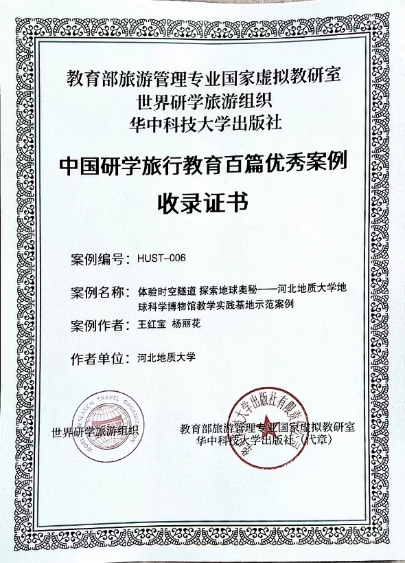 地球科学博物馆教学实践基地示范案例”被世界研学旅游组织、教育部旅游管理专业国家虚拟教研室等组织收录“中国研学旅行教育百篇优秀案例”,被收录的案例将在2024年马来西亚世界研学旅游大会上发布,并通过多种渠道向国际社会广泛传播,加大宣传力度,体现了我校在研学教育与实践方面雄厚实力和先进水平。