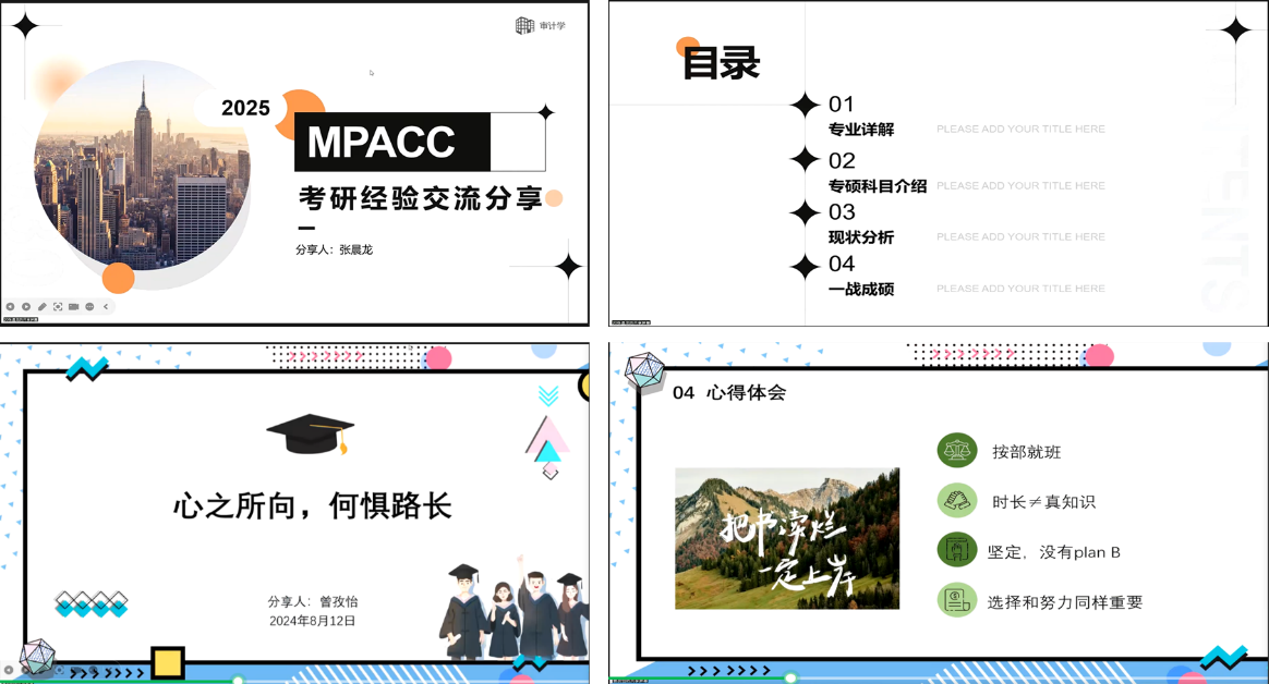 其次,我校2024届审计学专业张晨龙、曾孜怡同学就自己的备考经验做了分享,两位同学就院校选择、专业选择、备考经验等方面做了无私分享。
